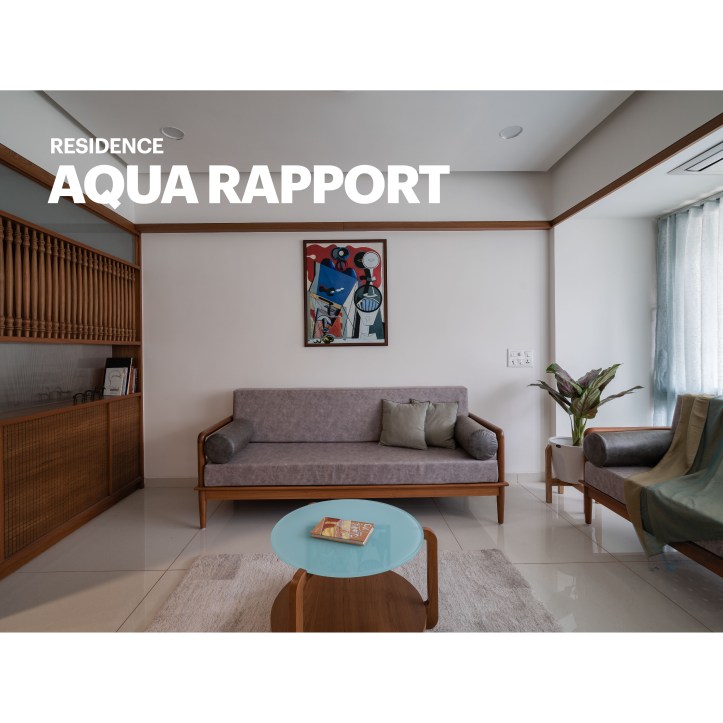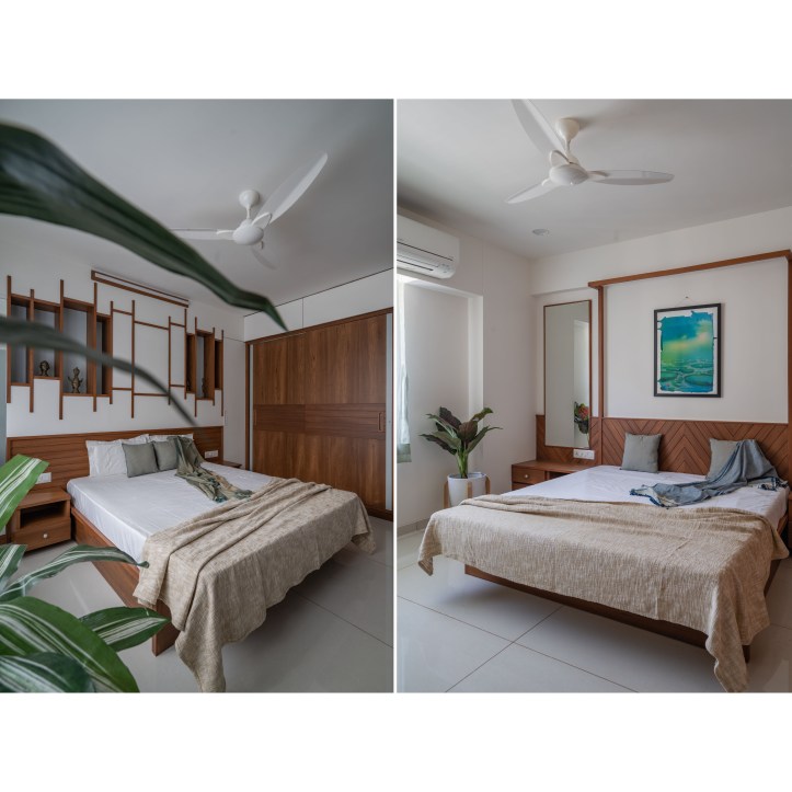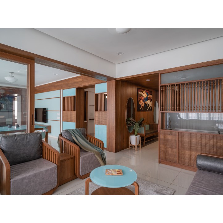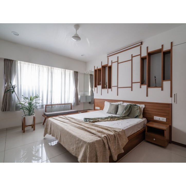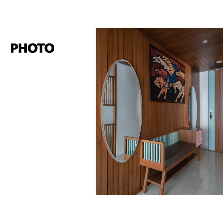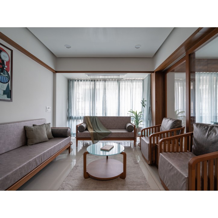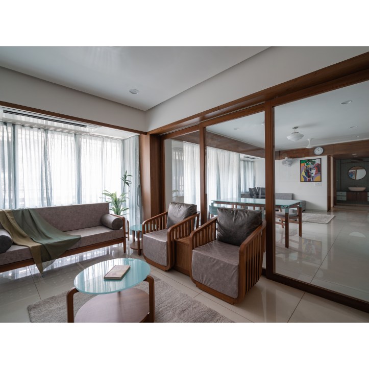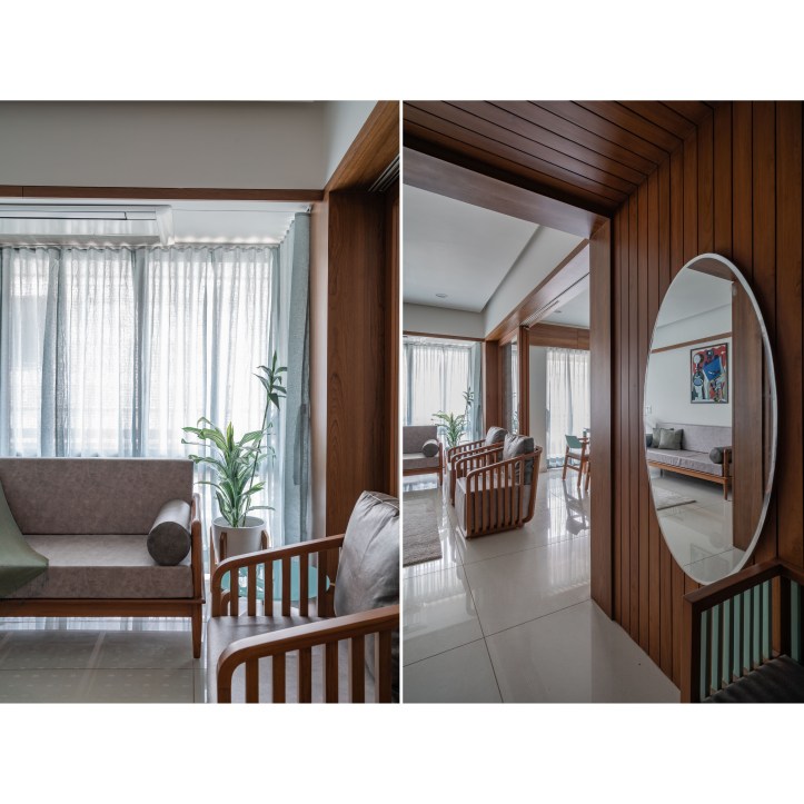 At the entrance of the house, a wooden textured wall with vertical strips welcomes us. We have used big circular mirrors to make the ambience look interesting. The seater designed is inspired from the traditional furniture called ‘Bakado‘. It is a seater with armrest and is generally placed at the entrance in the traditional houses. It works as a waiting area for the visitors. From this vestibule space we are guided towards the Living room. We have kept a monochromatic palette with wood, to enjoy maximum daylight within the Living area. The sheer in the backdrop adds to the serene and calm environ of the space.