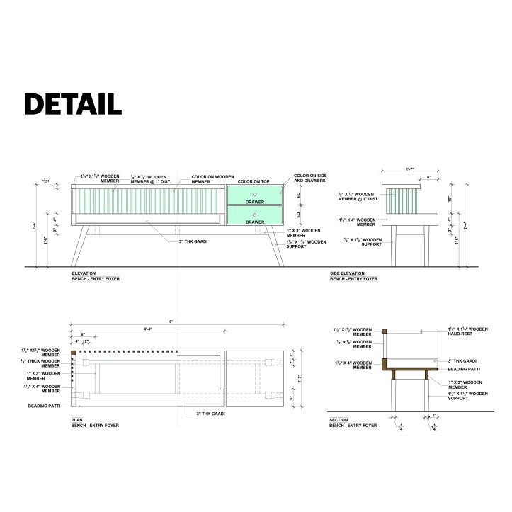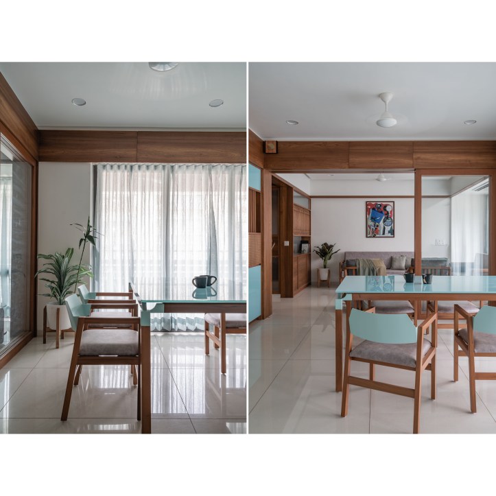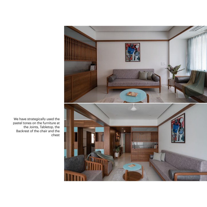 For the Dinning space, we have used pastel tone of Revival green and Scarlett. The pastel tone breaks the monochromatic palette and sequentially compliments the ambience. We have strategically used the pastel tones on the furniture at the Joints, Tabletop, the Backrest of the chair and the chest. Pastels combined with wood gives a queer look to these elements. The Furniture is read as distinct elements in the space with a monochromatic background of the Family area.