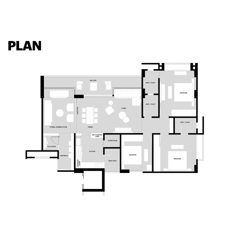 The interior concept is defined by enjoying the spaciousness allowing maximum natural light. The interior elements like the Furniture, the wall textures, the ceilings, the tapestries all together are designed to celebrate this spaciousness within the apartment space. We have used wood, hues of grey combined with some pastel tones to create a warm and inviting space.