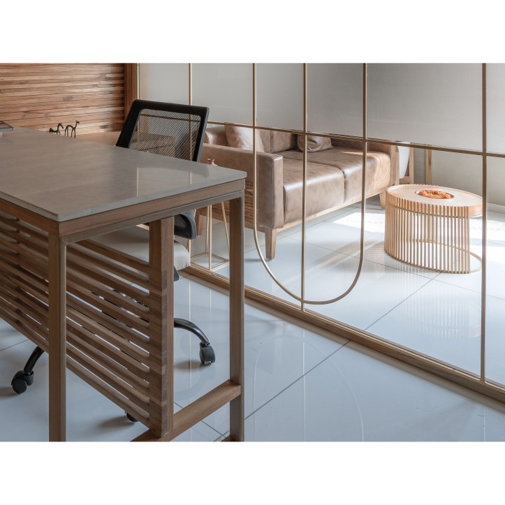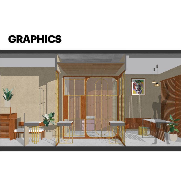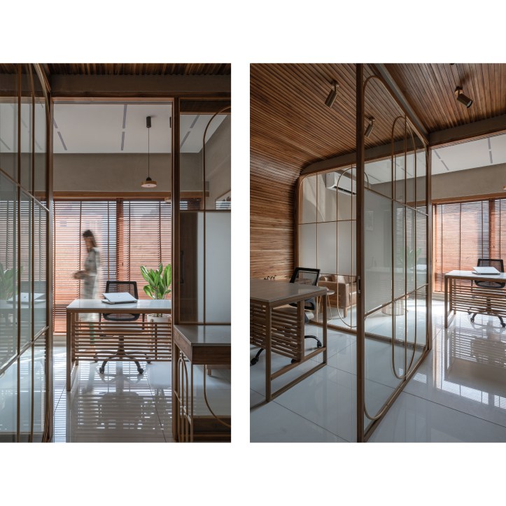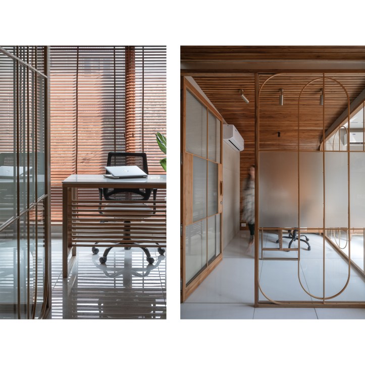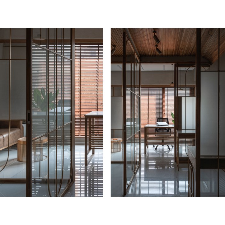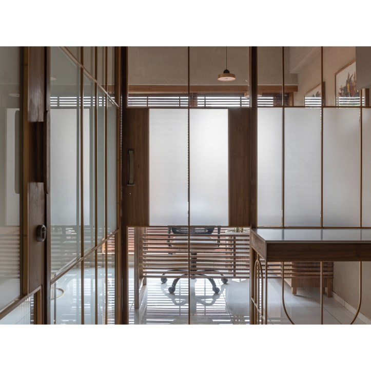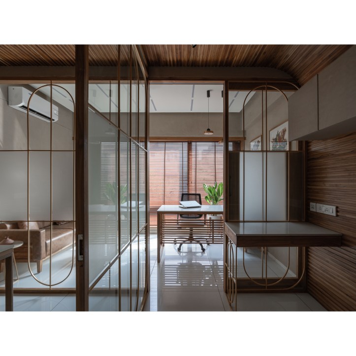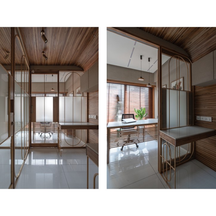 Glass with different tints is used to carve out diverse spaces catering to varied functional requirements. The glass is coupled with delicate arched brass frame. The glass is articulated to create interesting inter-reflection and refraction situations within the space. Light passes across the boundary between two of the glass and creates refraction. This creates delusions of spaces with different tones of natural light. It also creates a matrix of shadow patterns of arched brass frame on the vertical (wall) and horizontal (floor) surfaces both. Hence, it gives a three-dimensional Dynamic space experience.Â