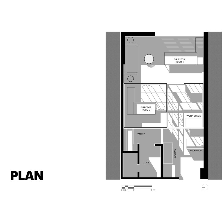 The space layout is compactly designed to achieve all the requirement of the client without losing the concept of open plan. The layout out comfortably accommodates Reception area with waiting longue; One small office cabin space; Three working staff table spaces; One large office space with separate waiting lounge and a Separate utility space with pantry.Â