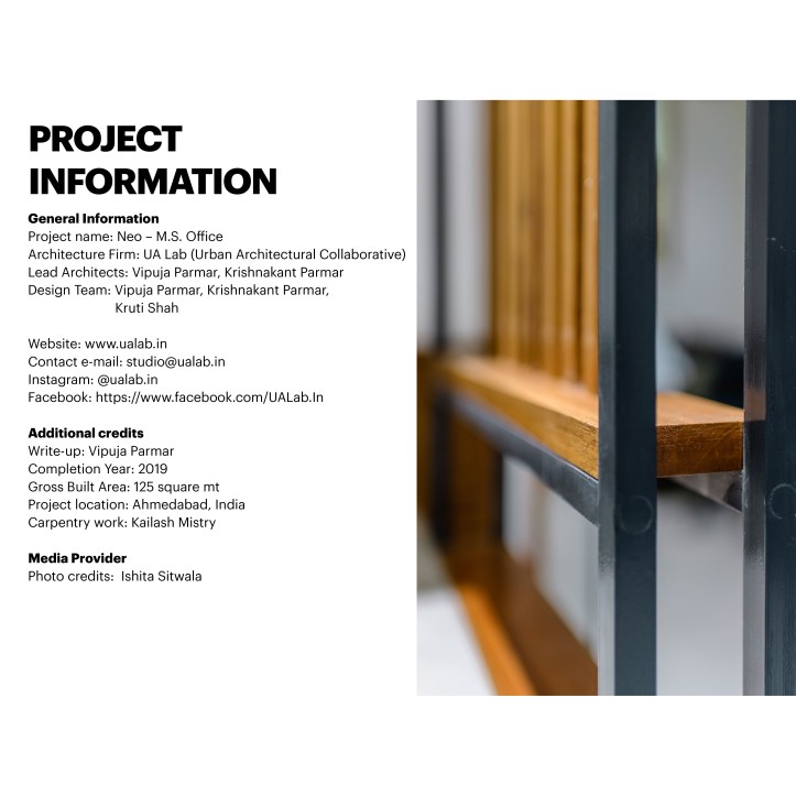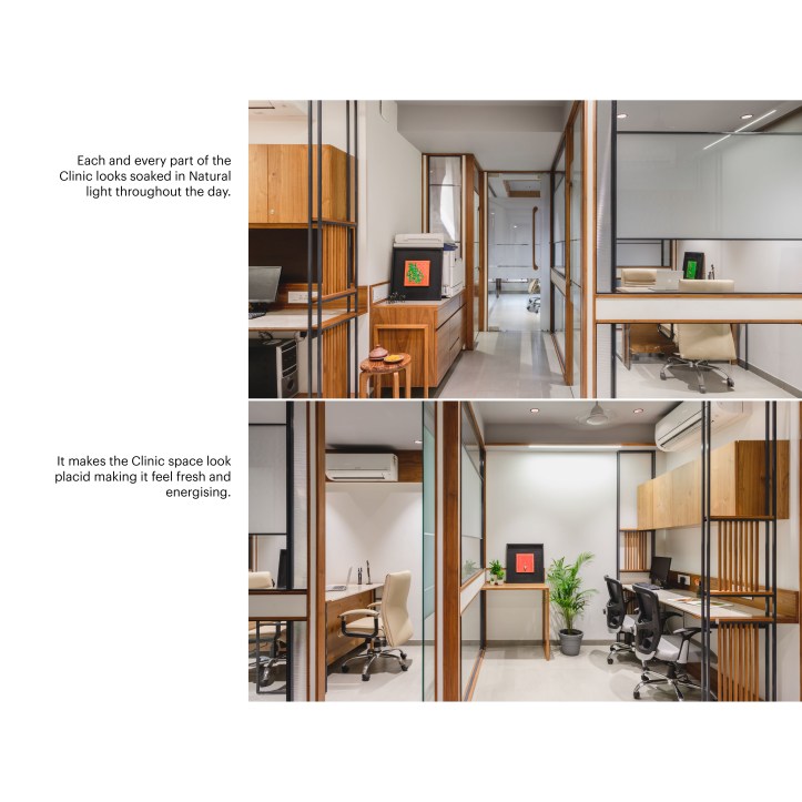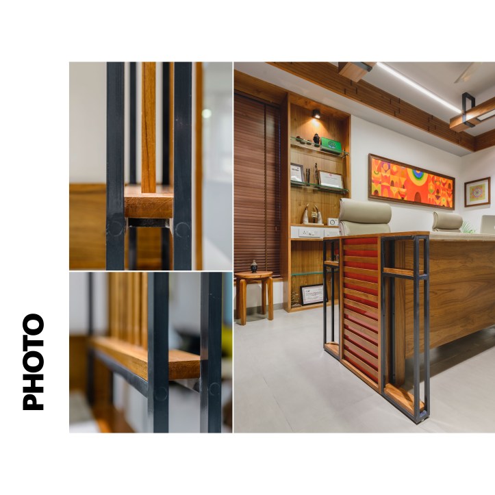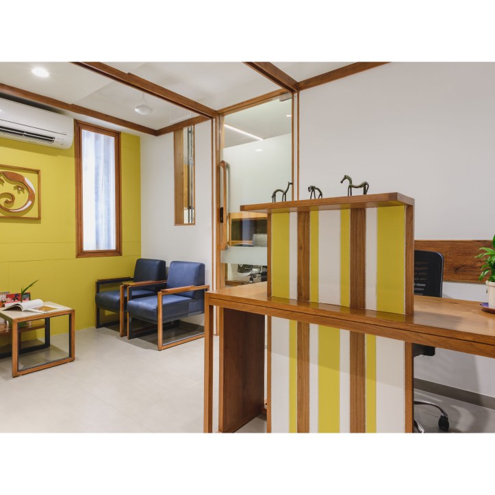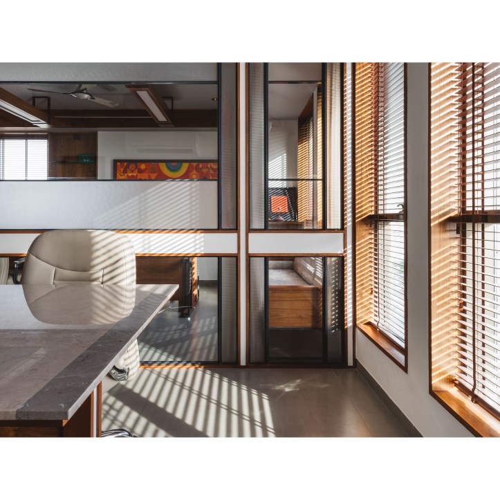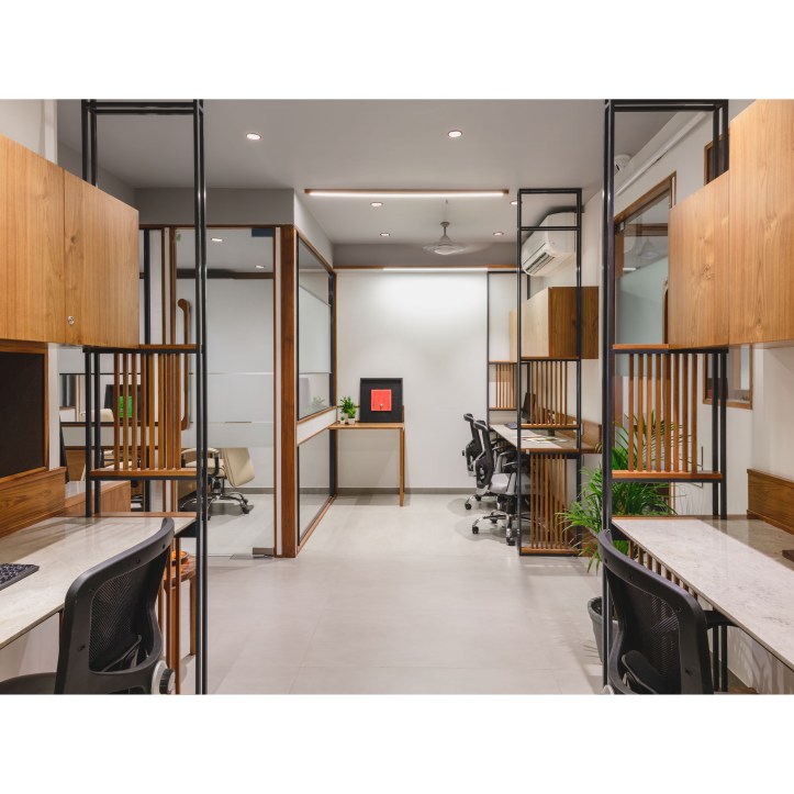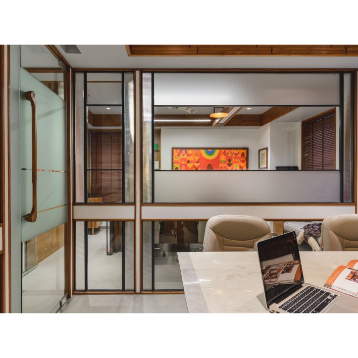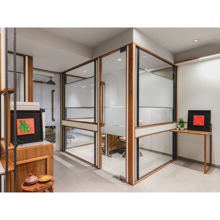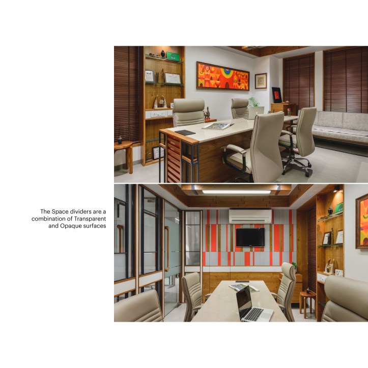 The Space dividers scoop out separate working spaces from the common multi-functional office space. The privacy of these separate working spaces need to be maintained. The Space dividers are a combination of Transparent and Opaque surfaces. The transparent surfaces are kept clear and smooth within the simple orthogonal geometry. The opaque surfaces are worked out with the combination of wood panel, colored surfaces, wooden louvers and Mild steel frame. The Dividers show an interesting combination of Clear Glass and layers of opaque surfaces intricately designed. When traverse through the office space interesting play of Transparent and Opaque interiors revealing-unrevealing it self is experienced. The clear glass creates multiple interior reflections making the spatial experience evocative.