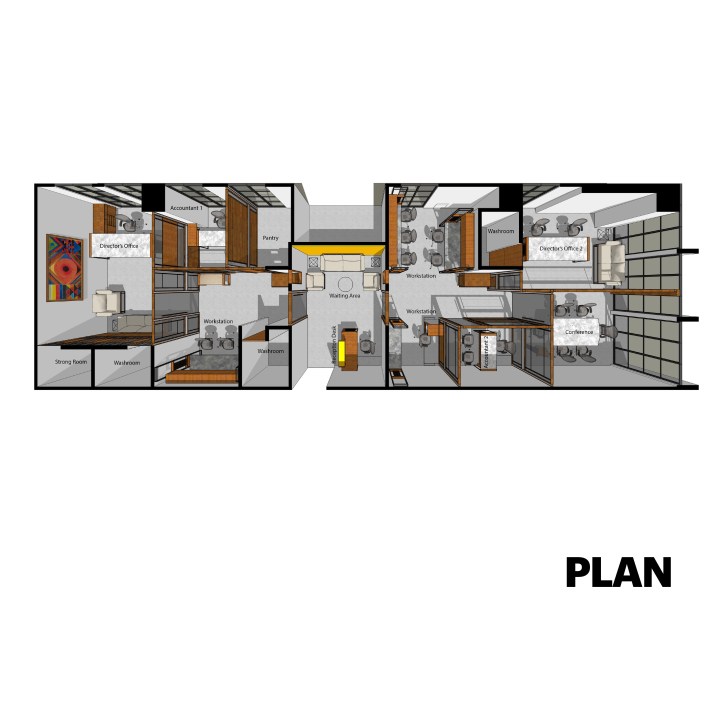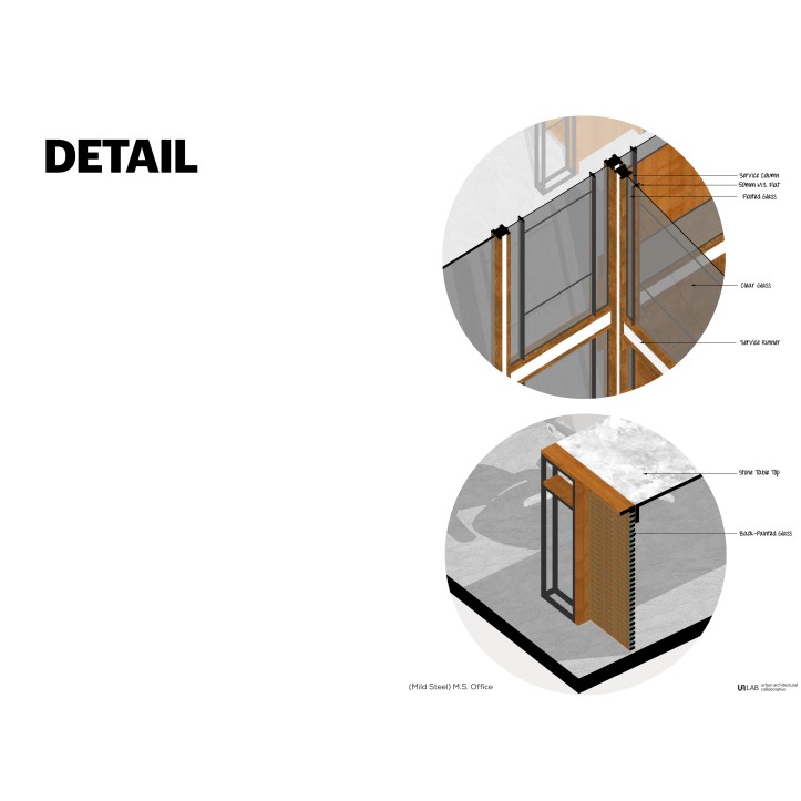 Mild Steel works as the main structural frame to combine Glass and Wood. Orthogonal geometry with the permutation of horizontal and vertical lines is used to create interesting surfaces. Glass, Wood and Mild Steel are used in their natural form to design simple yet elegant interiors.
