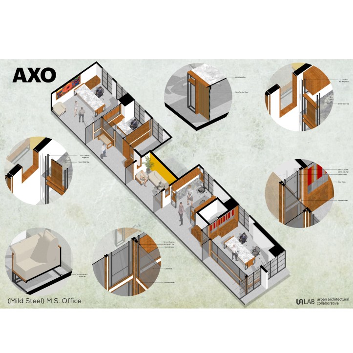 Mild Steel, Glass and Wood are the primary materials used in the design. Combinations of these materials are detailed to create Space dividers, Furniture, Lighting fixtures, Ceiling details and Wall Murals.