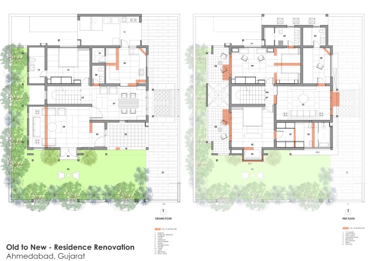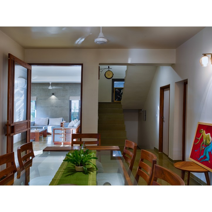 Our first few experiences on the site was with the peacocks and peahens around us under the greens. All our site experiences guided us to develop a design without compromising on the existing open spaces available to the users. For the design process we focused on exploring the quality of spaciousness within the existing built up than creating larger spaces. We tried to open the inner spaces of the house towards the outer garden. This helped in establishing stronger relationships with the outside green and get in more light and air.