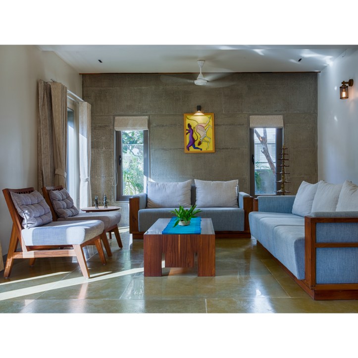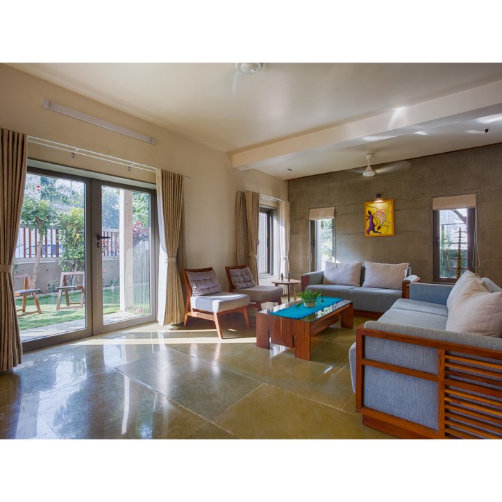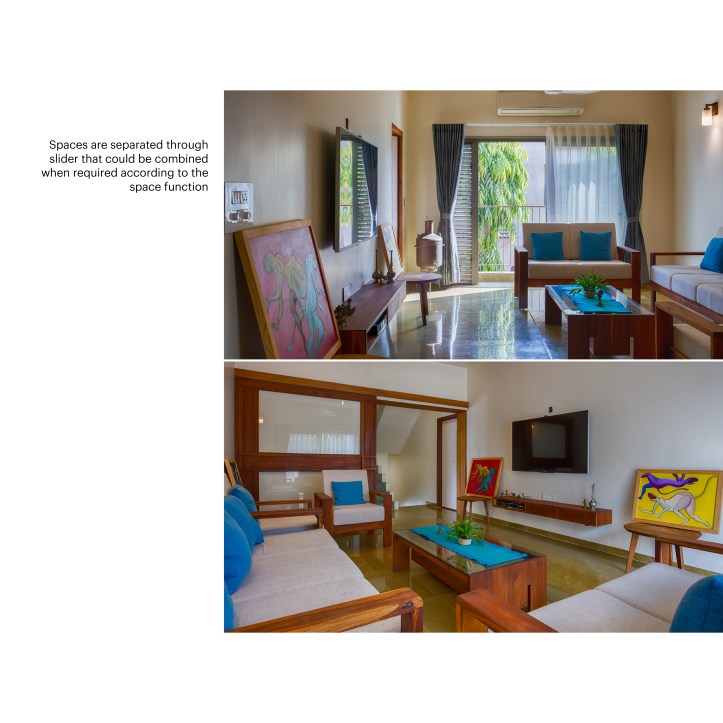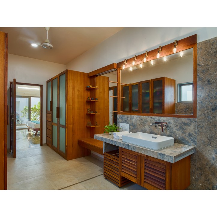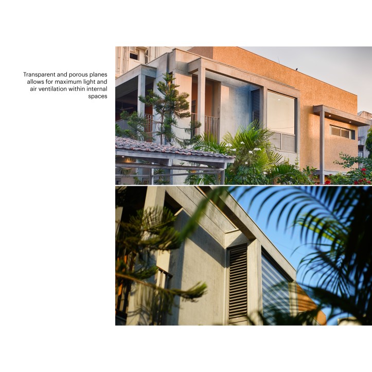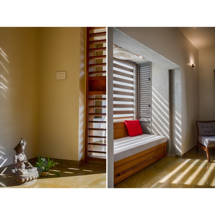 The living room opens up entirely to the garden side. The dining area opens into verandah on the east side. On the first floor level, the rooms opens up into the huge balcony space. The balcony shared between the rooms is designed as a verandah space. It opens up in the garden on one side. It becomes the most important living space for the family during the evening hours of the day. We tried to enhance the spatial quality of space through certain features like bay window in the Master bedroom area. The feature of sky light is added in the bathroom area.